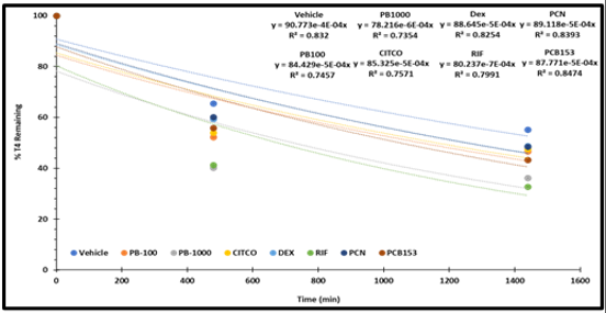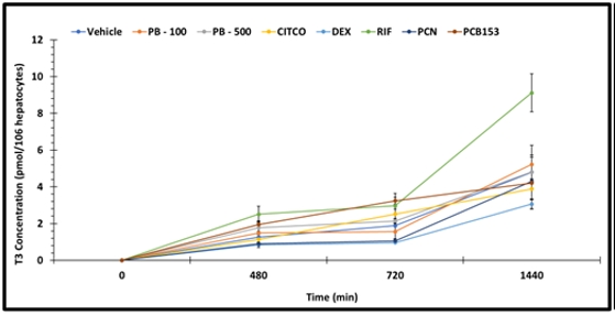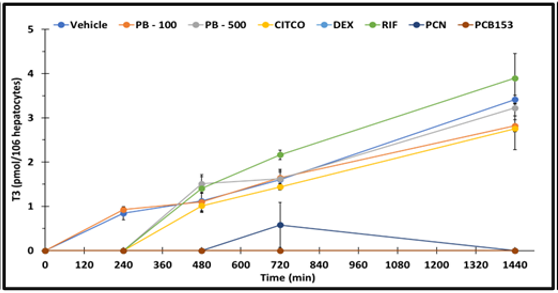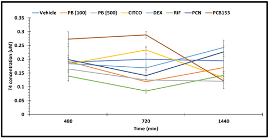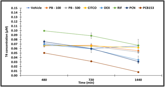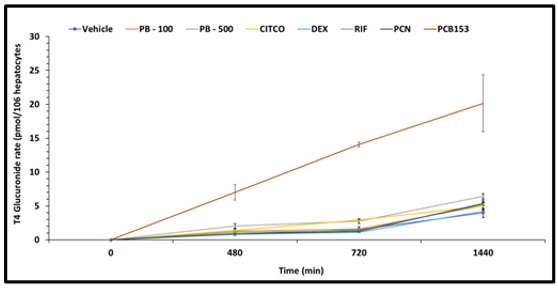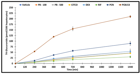 T4 metabolism in Rat and Human: T4G production in both species showed a constant increased of T4G over 24-hours. Significant higher rate of production was seen in rat (SD) compared to human. PCB153 and PCN exposure has further increased the production in rat over 24-hours. While in human only PCB153 exposure has increased T4G production (relative to DMSO control). T4S no peak was observed in both species. T3 production in both species was at a similar rate with a consistent increase over 24-hours. RIF exposure has increased the production in human after 24-hours (not seen in rat). T4 concentration in media decreases after exposure to PCB153 (11%), PCN (44%), and PB500 (75%) after 24-hours in rat. While in human, the decrease was noticed after exposure to PB500 (63.5%), RIF (75%) and PCB153 (64%). T4 clearance rate Intrinsic clearance (CLint (in vitro) of T4 in the rat model after PCB153 and PCN treatment was calculated at 4.2 and 1.9 µL/min/106 cells, respectively. While in human tri-cultures, Intrinsic clearance (CLint (in vitro) of T4 after PB and RIF was calculated at 1.2 and 1.4 µL/min/106 cells, respectively.