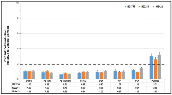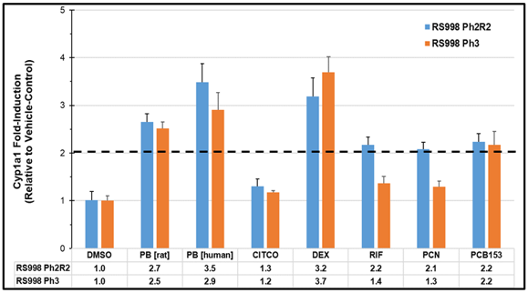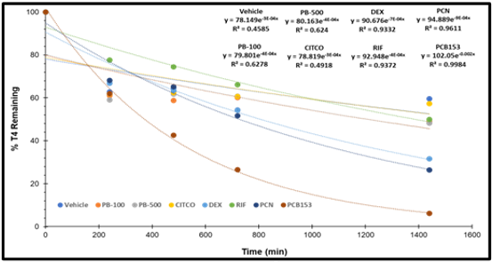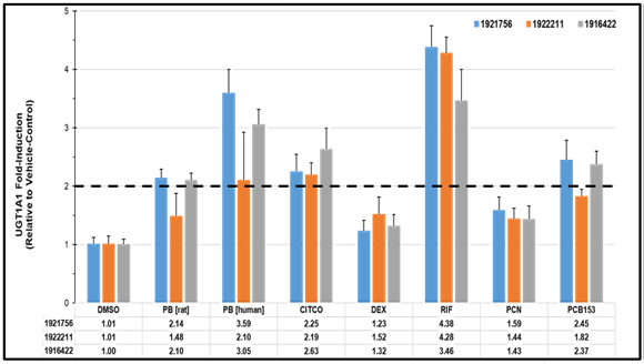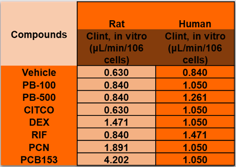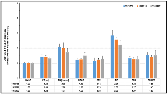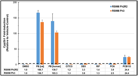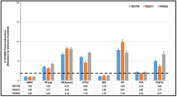 Repeated 7-day exposure to Phenobarbital (PB, 100 and 500μM), Rifampicin (RIF,10μM), Pregnenolone 16α-carbonitrile (PCN, 20μM), Polychlorinated biphenyl 153 (PCB153, 30μM).