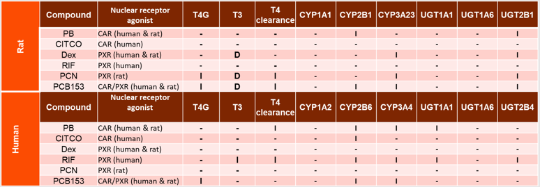 Species difference in T4 clearance was observed with PCN (rat-sensitive), PCB153 (rat-sensitive) and RIF (human-sensitive).