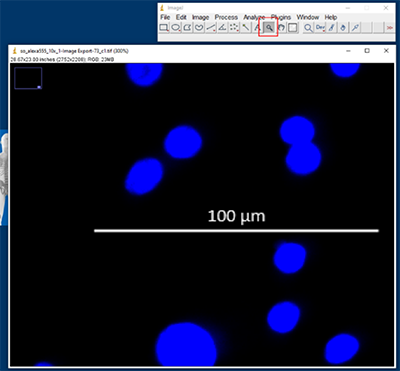 The scale is set in ImageJ based on the microscope scale bar,